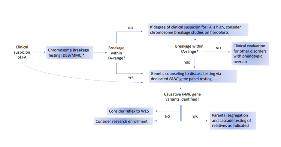 - “The recommended testing procedures are outlined in the flow chart in Figure 1. The flow chart presents one potential algorithm for testing, starting with chromosome breakage testing and ending with genotyping. However, genetic testing has become increasingly utilized as a first-line diagnostic test, especially for newborns and pediatric patients with multiple congenital anomalies. Regardless of the order of testing, it is important that both chromosome breakage and germline genetic testing be performed to obtain a precise diagnosis in all persons with suspected FA.”